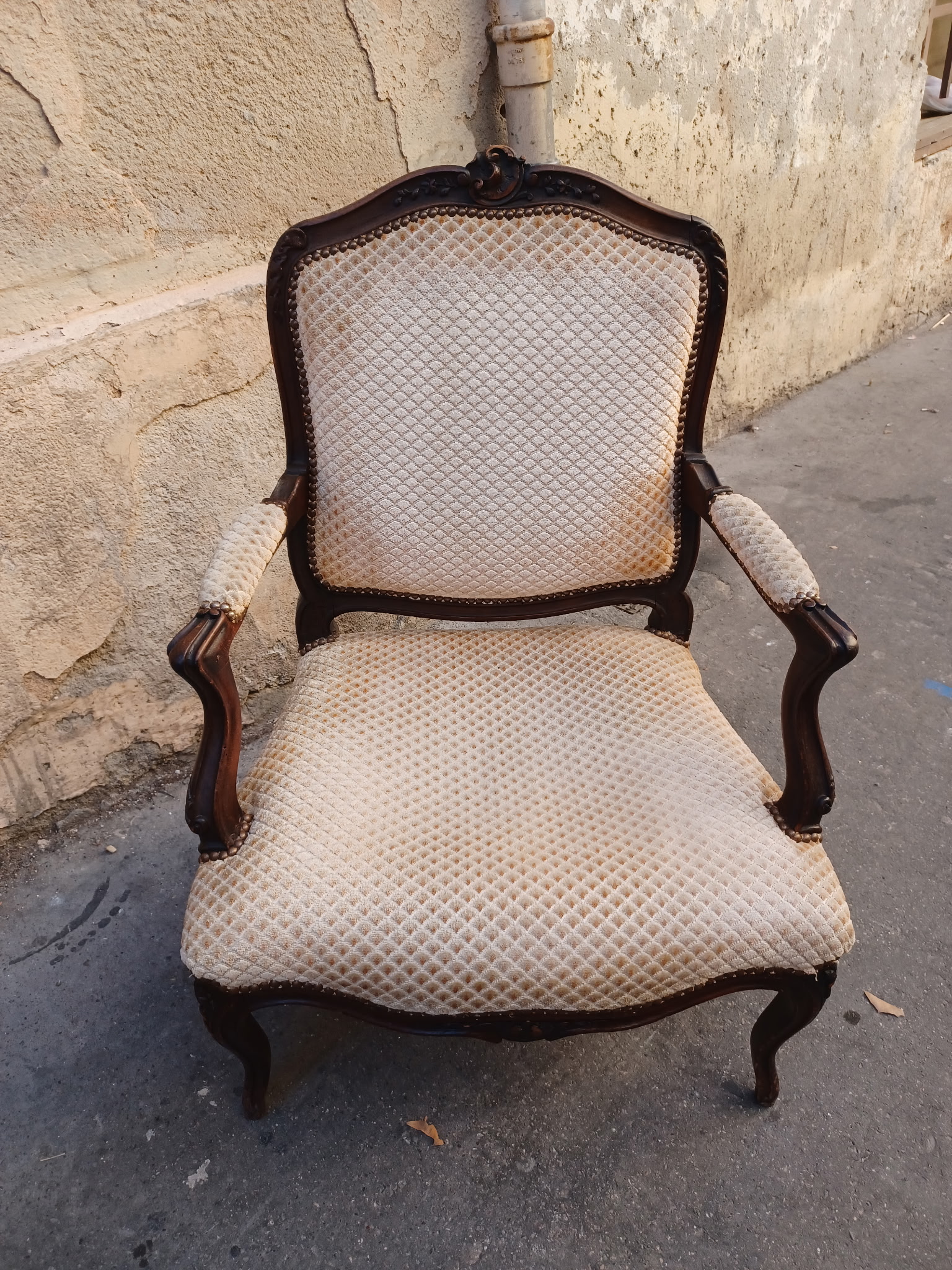- Sagement assis sur le trottoir, ce vieux fauteuil d’esprit Louis XV attend une rénovation, sûre il y a du travail, mais patience et huile de coude feront l’affaire !!!